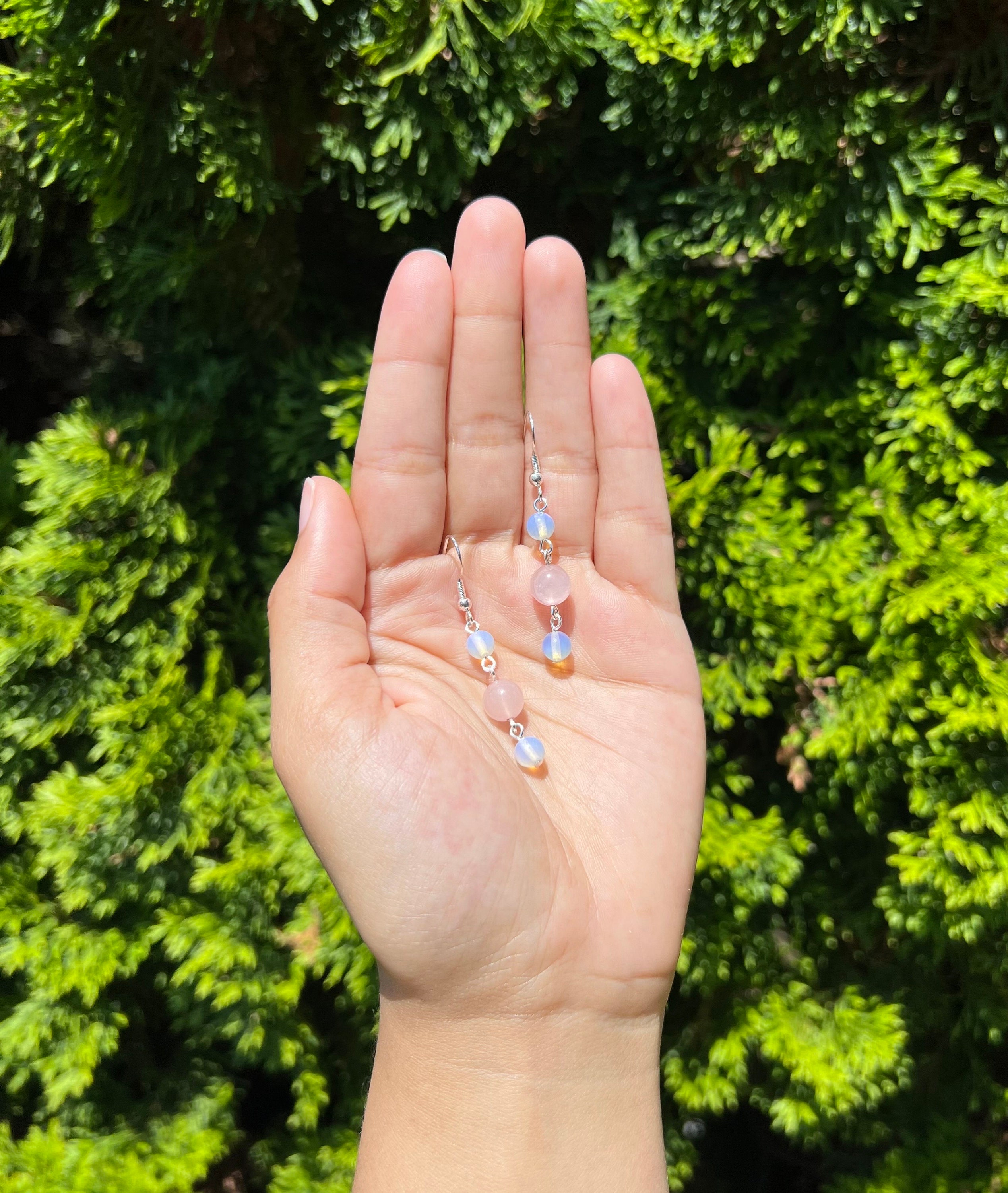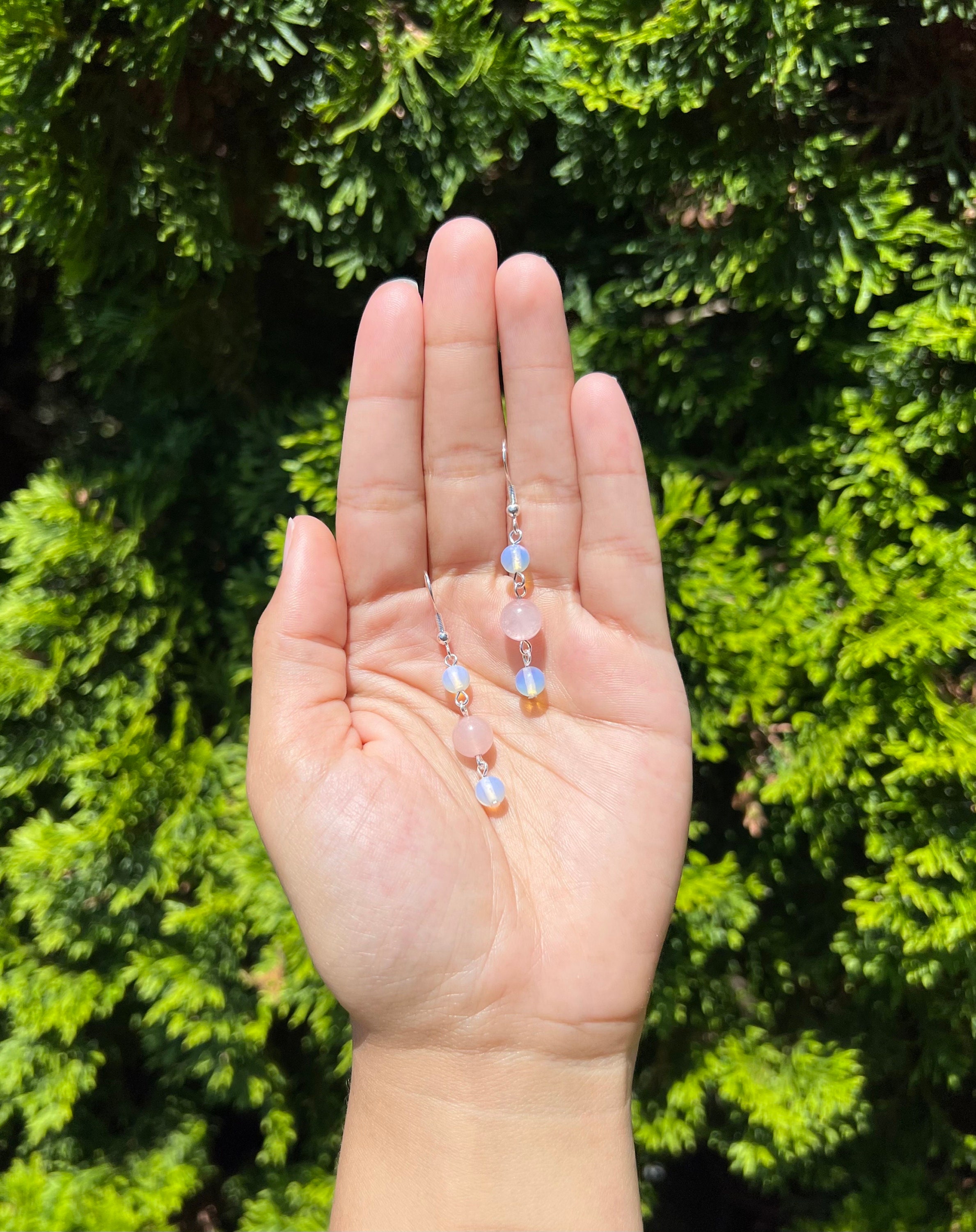 Handmade rose quartz & opalite crystal beaded dangle earrings. Using natural genuine stones acquired from my local metaphysical shops and other vetted sources.