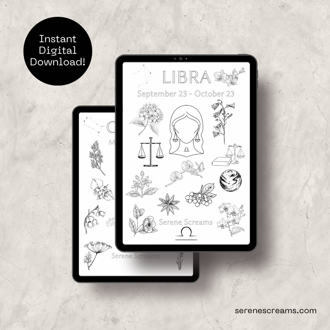You will receive 4 printable PDF files of Serene Screams Zodiac Coloring Pages. Coloring pages will include our collective zodiac page and the air signs: Aquarius, Gemini, & Libra. Once your payment has been approved, you will receive instructions from Etsy on how to download your new coloring pages. The files can also be found in your account under 'Purchases and Reviews.'